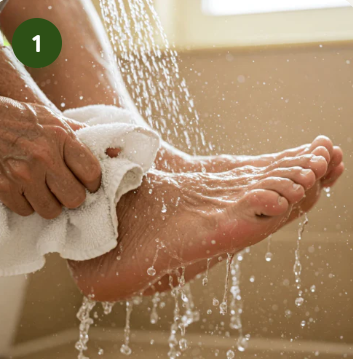 Lavez et séchez soigneusement vos pieds, en insistant sur les zones entre les orteils où les champignons prolifèrent.